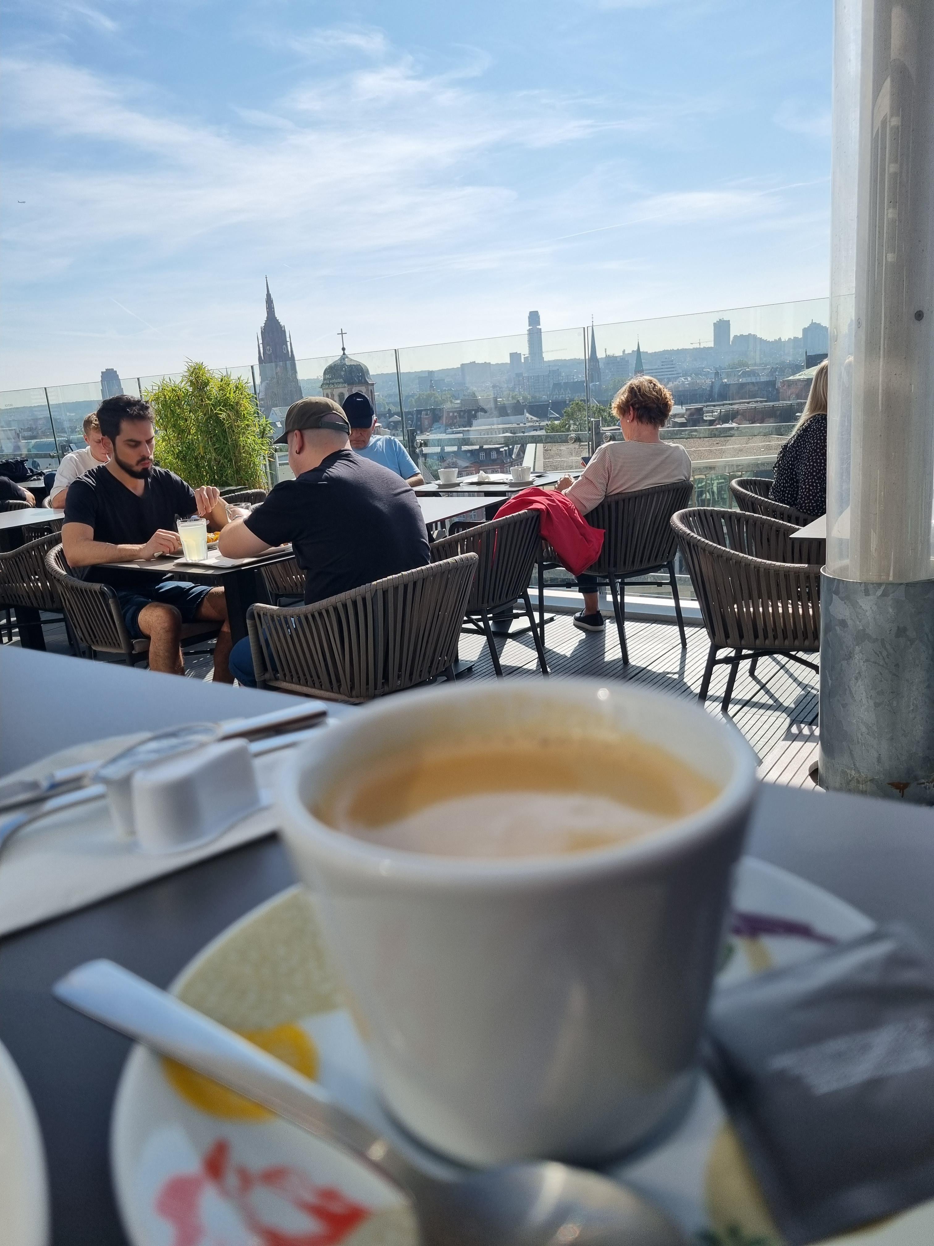 이번엔 갤러리아 루프탑에서 커피도 마셨다. 지난번 출장 때 갔을때는 쉬는 날이라 올라가지 못했었는데 그때의 아쉬움을 달래며 커피와 달콤한 케익을 즐겼다. 많은 사람들이 자리잡고 브런치와 와인, 맥주, 우리처럼 커피와 함께 수다 삼매경에 빠져있었다. 거기 앉아 프랑크푸르트 시내와 마인강을 직관했다. 내가 다시 프랑크푸르트에 왔구나. 하늘도 공기도 표현할 길 없이 말고 깨끗한 날이었다.