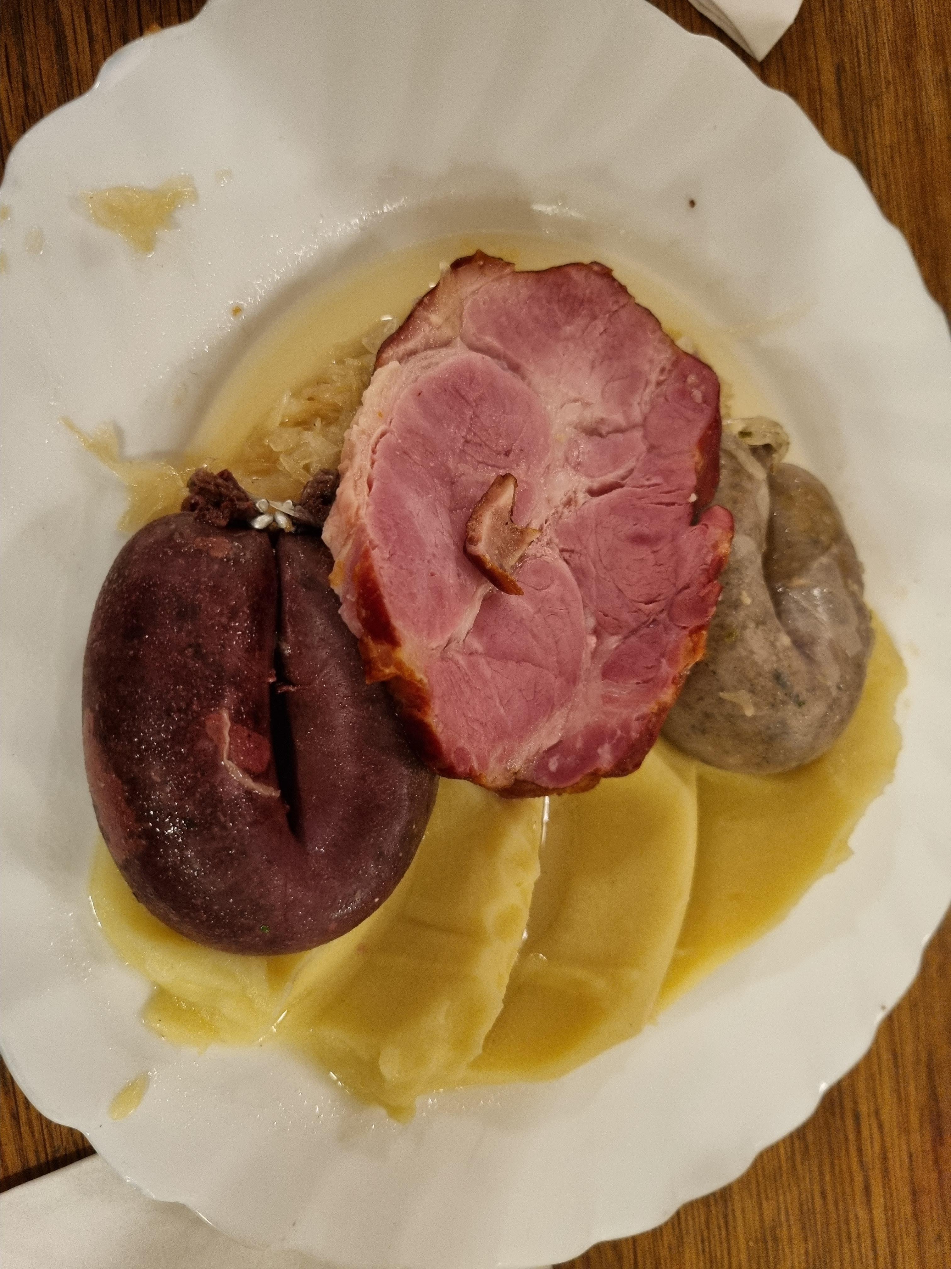 소세지, 슈바인학세, 버섯과 감자요리(이름 모름)