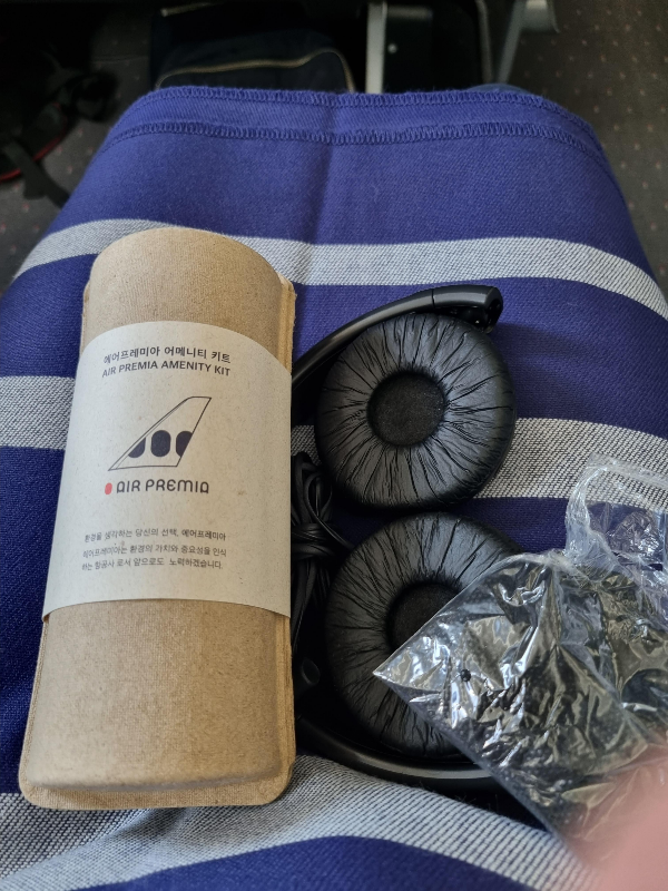 자리를 찾아가니 담요와 어메니티케이스, 이어폰이 기다리고 있었다. 슬리퍼도 있었는데 찍히지 못했다.