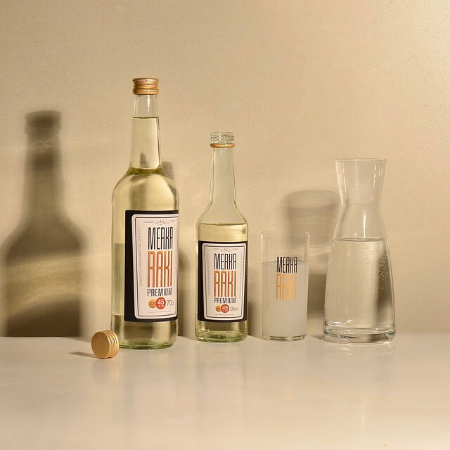 라키를 마실 때 사용하는 전용 잔은 투명한 유리로 된, 폭이 좁고 긴 잔입니다. 보통 물과 라키를 1:1로 희석해서 마시는데 식당에서 라키를 주문하면 웨이터가 알아서 서빙을 해줍니다. 취향에 따라 얼음을 추가해서 마시기도 합니다.