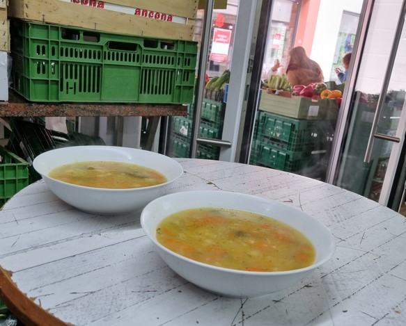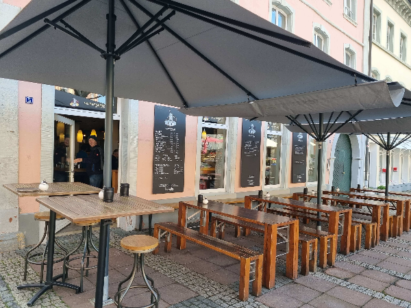 돌아다니다 보니 출출해져 현지사람들이 먹는 음식을 찾아 나섰습니다. 식료품점과 식당을 같이 운영하는 곳인데 야외테이블은 이미 만석이었고 가게 안 스탠딩 테이블에서 감자수프와 덤플링을 먹었습니다. 쌀쌀하던 그날의 날씨에 맞게 수프의 따듯함이 추위까지 덜어주었습니다. 속을 확 풀어주는 감자수프는 예전부터 서민들이 즐기던 음식이라고 합니다. 덤플링은 별맛 없는 밀가루 빵인데 함께 나온 수프에 찍어 먹었습니다. 독일인들에겐 시골에 오면 먹을 수 있는 추억의 음식인 듯합니다.