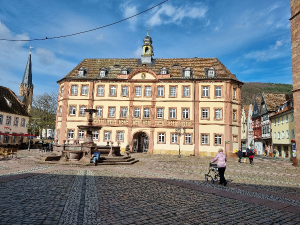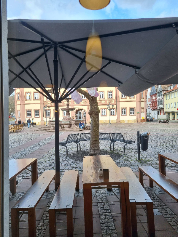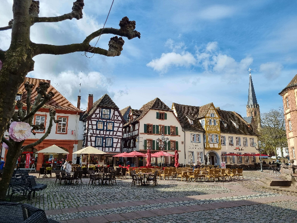 마을탐방은 팔츠지역에서 가장 아름다운 광장이라고 하는 마크트플라츠(Marktplatz)에서 시작했습니다. 먼저 광장이 내다보이는 카페에 자리를 잡고 앉아 커피 한잔을 마시며 동네 분위기를 살펴보았습니다. 광장에 앉아 혼자 커피를 마시고 있는 멋진 청년이 눈에 띄어 몰래 훔쳐보고 있었는데 어느새 친구가 나타나 청년을 낚아채 가버렸습니다.