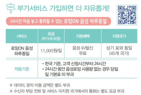 그리고 통화가 많은 비즈니스 출장이라면 로밍ON음성 요금제에 가입하면 하루종일 통화해도 11천원에 사용가능합니다.