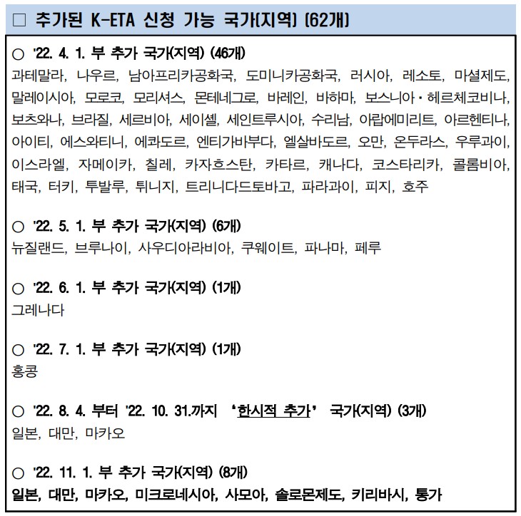 K-ETA 한시면제 국가( '25.12.31.까지 연장)