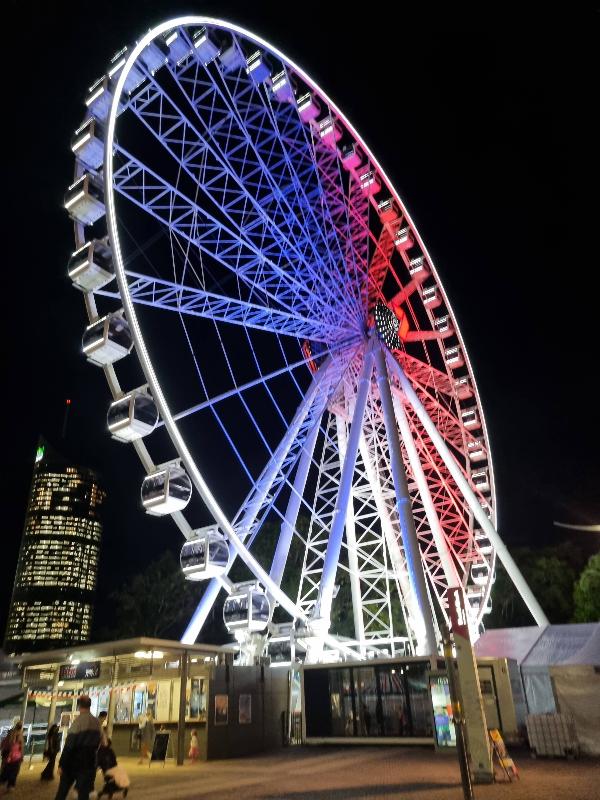 이날 밤엔 마침 프랑스 축제가 열리고 있었습니다. 성큼 다가온 파리 올림픽을 홍보하기 위한 것인지 브리즈번 브리지와 휠에 프랑스 국기를 상징하는 세 가지 색깔의 조명이 가득 채워져 축제 분위기를 한껏 고무시키고 있었습니다. 사람들이 가득 몰려있는 모습에 솔깃해서 갔더니 입장료가 12달러였고, 프랑스 파리로 직접 가리라 호기를 부리면서 분위기만 느끼고 돌아섰습니다.